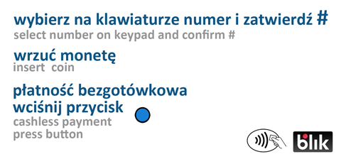 Płatności za usługę dokonujemy za pomocą monet lub żetonów, zbliżeniowo kartą, kodem Blik. Urządzenie może obsługiwać również karty mieszkańca oraz karty przedpłacone.